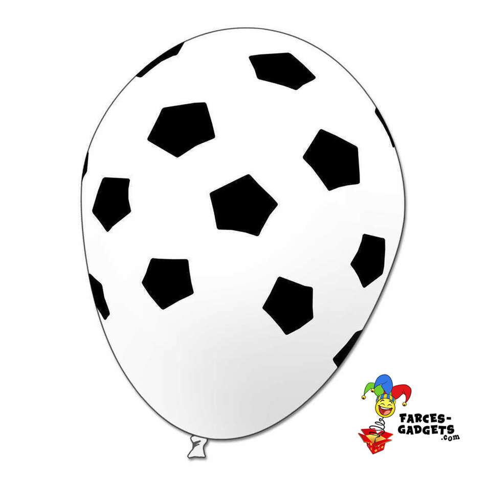 Ballons de baudruche gonflables, imprimés noir sur fond blanc imitant un ballon de football. Qualité supérieure, diamètre standard 30 cm, couleurs vives, conditionnés en vrac dans sachet, quantité au choix, (lot de 10 ou 25 ballons).