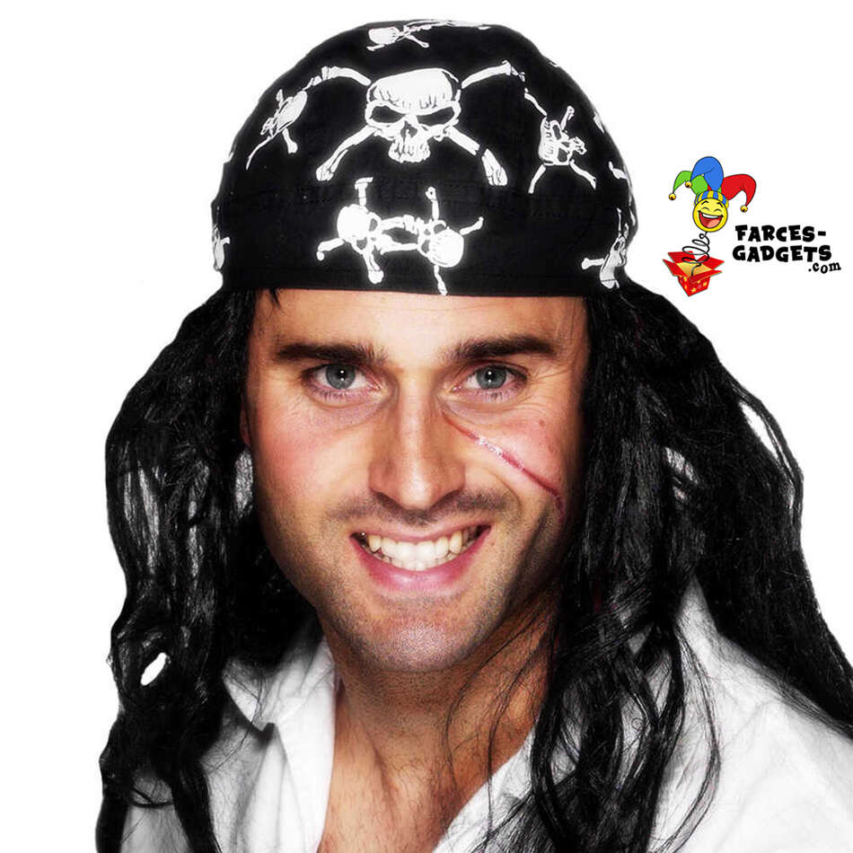 bandana de pirate à têtes de morts foulard bandeau madras carré de tissu noir et blanc corsaire flibustier jack sparrow capitaine crochet bandit squelette accessoire de déguisement