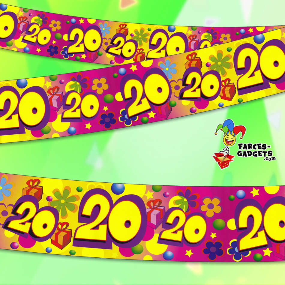 Bannière couleur anniversaire pour les 20 ans, festive et joviale, elle sera du plus bel effet, à fixer à l’aide de punaises, (matière carton glacé, hauteur 16 cm, longueur 2,44 mètres, imprimée sur une seule face, prix unitaire).