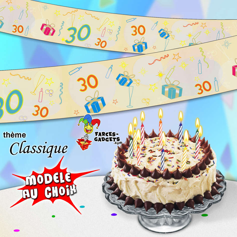 Bannière couleur anniversaire pour les 30 ans, festive et joviale, elle sera du plus bel effet, à fixer à l’aide de punaises. Modèle au choix : thème « classique » plus sobre ou thème « festif » plus coloré, (matière carton glacé, hauteur 16 cm, longueur 2,44 mètres, imprimée sur une seule face, prix unitaire).