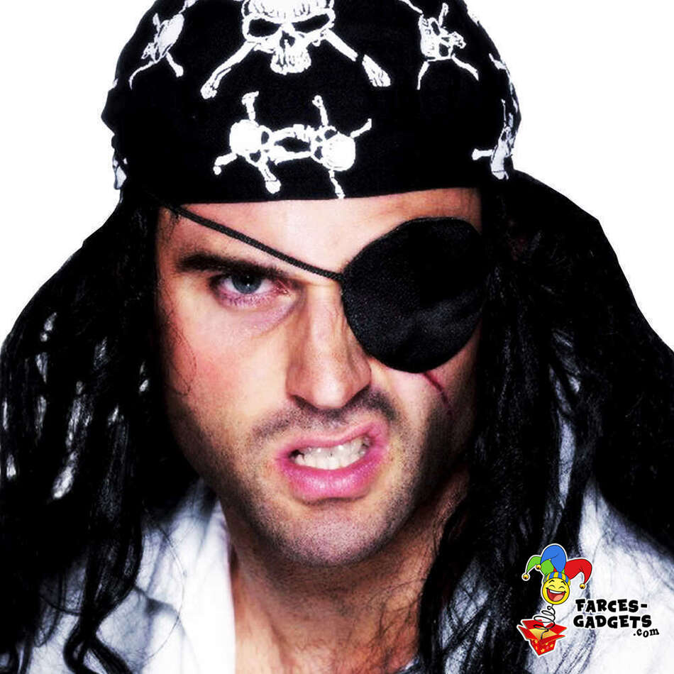 Cache-oeil de pirate semi-rigide habillé de tissu noir satiné, tient autour de la tête au moyen d’un fil élastique incorporé.