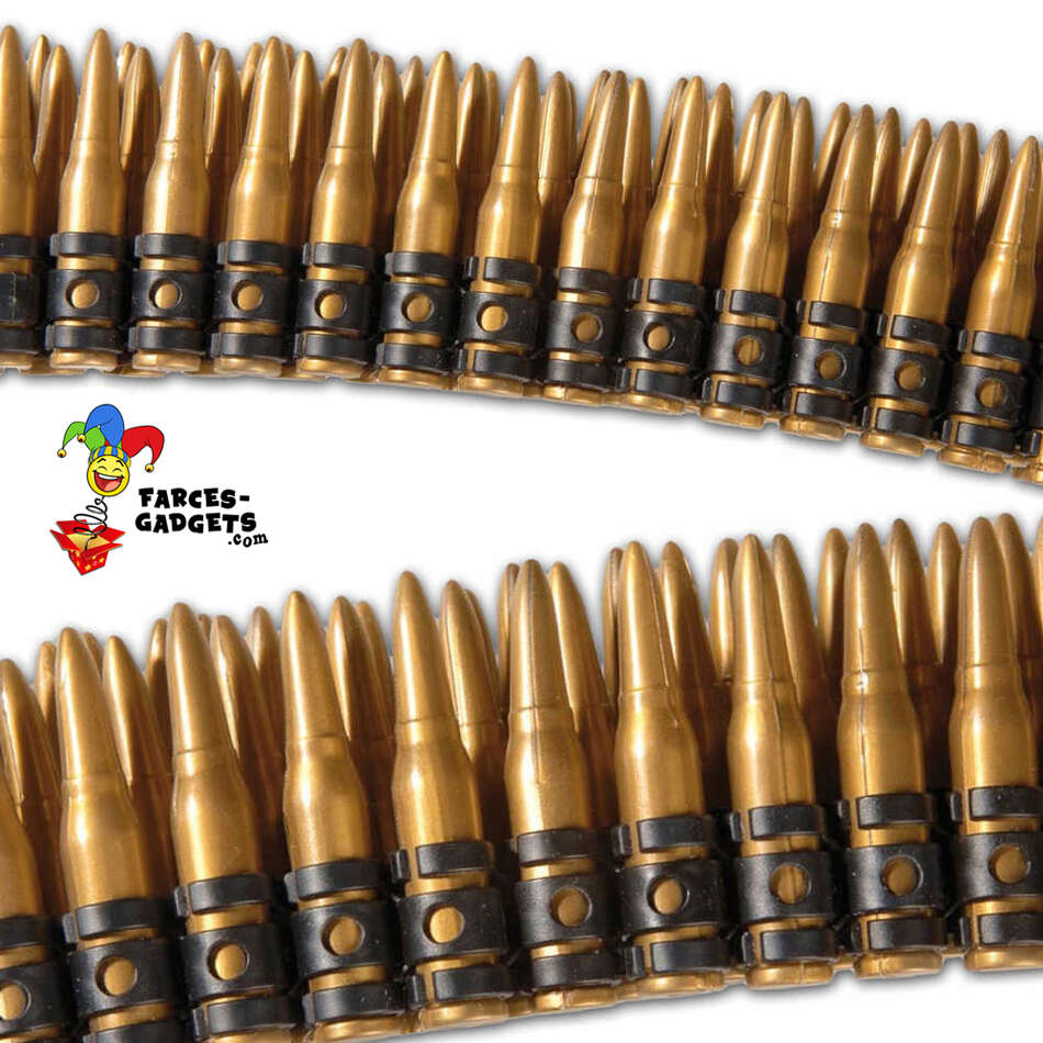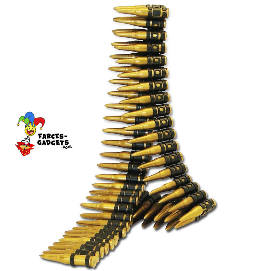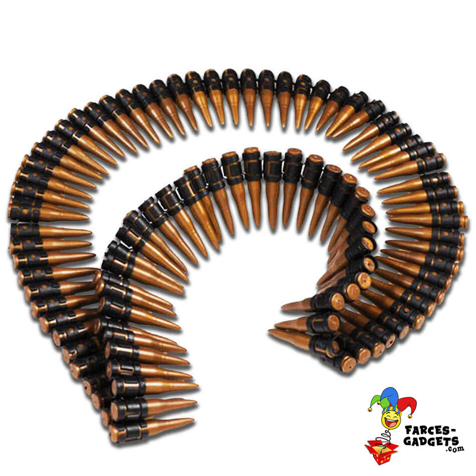 Matière plastique, longueur 1,60 mètre, entièrement démontable, contient 95 munitions environ, indépendantes et amovibles chacune de longueur 7 cm et d’un diamètre à la base de 1,3 cm (13 mm), très belle imitation, effet réaliste.