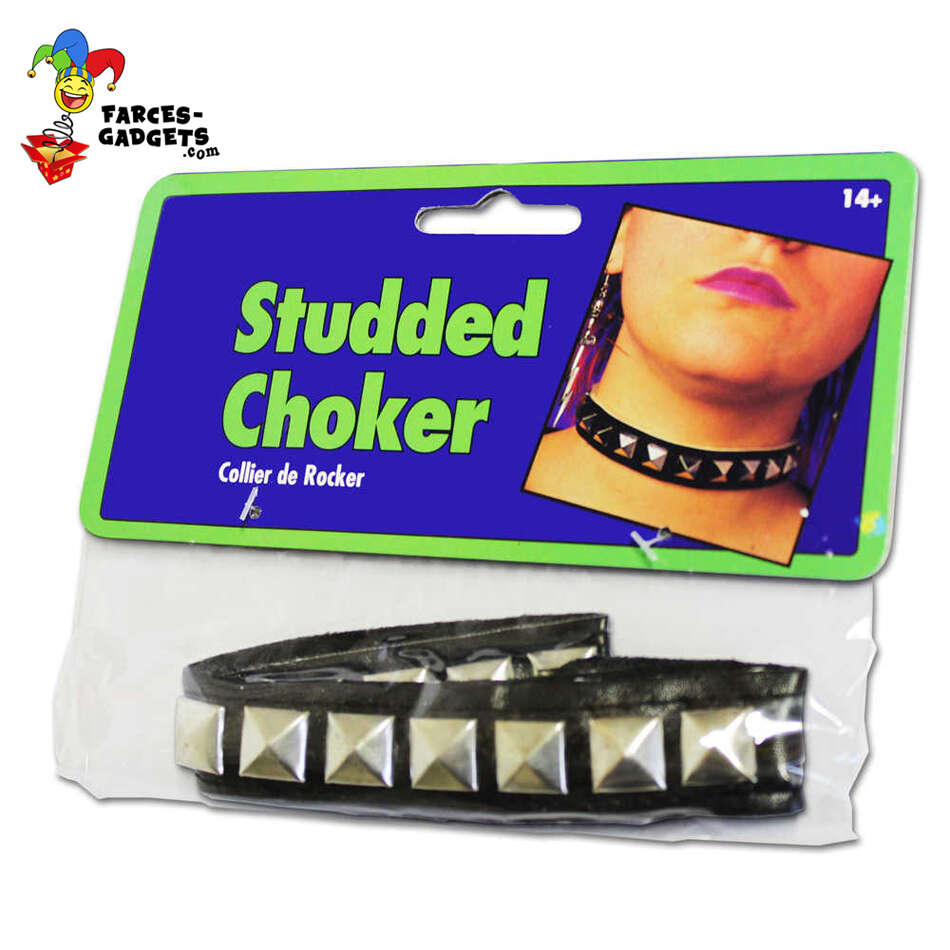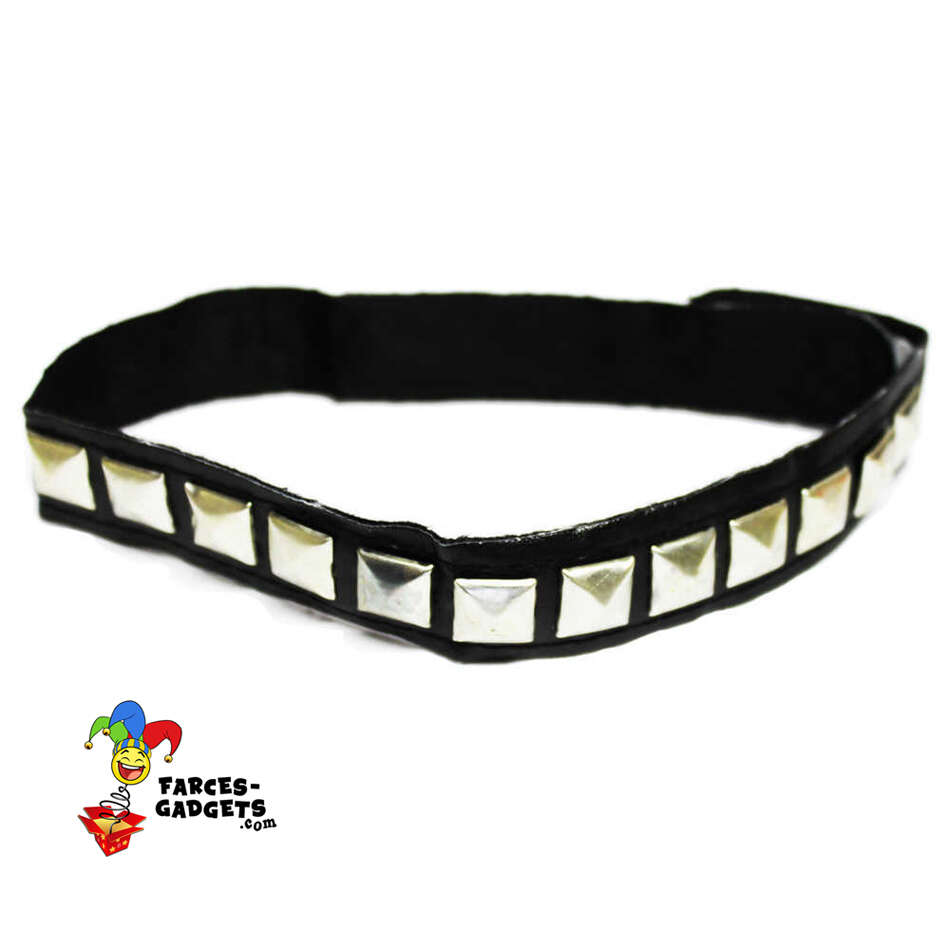 Collier avec un rang de studs métal, largeur 2,5 cm, longueur 42 cm, fermeture par bande velcro, accessoire mixte : homme ou femme, taille unique adulte / adolescent.