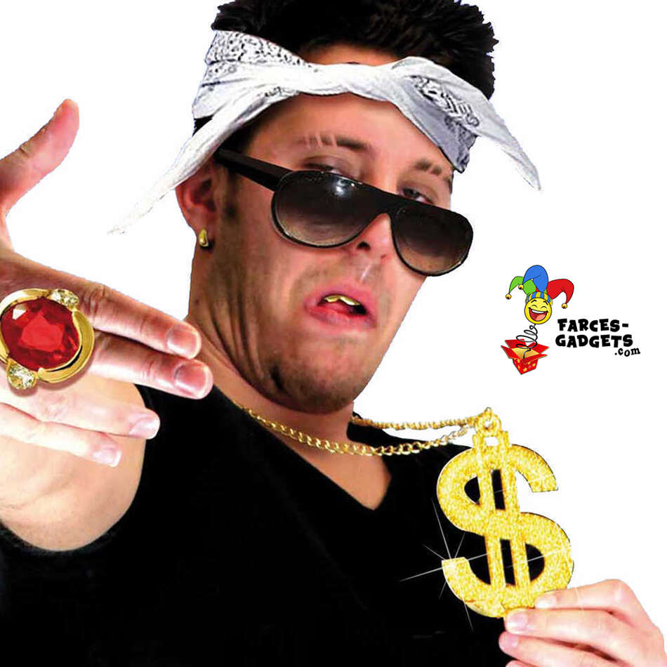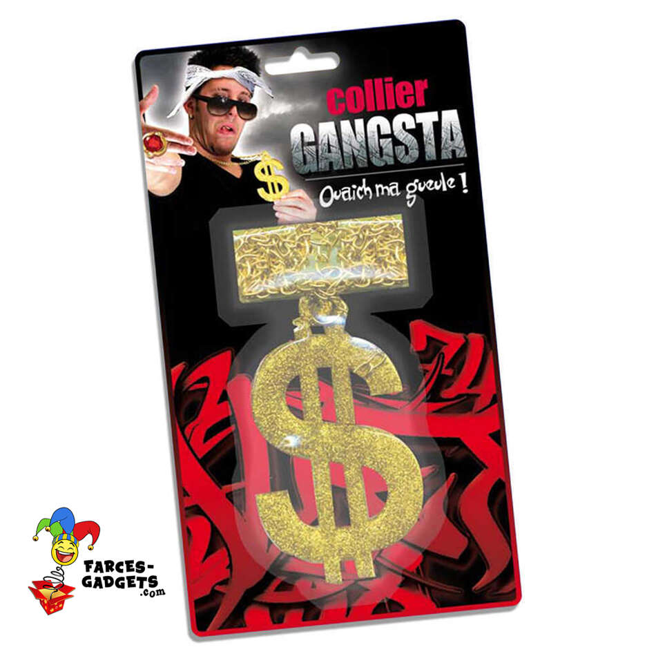 Envie de briller comme un vrai rappeur ou de jouer les mafiosos fortunés le temps d’une soirée ? Ce collier dollar doré gangsta est l’accessoire déguisement qu’il vous faut pour afficher votre richesse et votre style bling bling sans vous ruiner ! Avec son médaillon géant en forme de dollar américain, ses maillons étincelants et son effet métallique doré, vous allez faire pâlir d’envie tous les bad boys du quartier. Que vous soyez un fan de rap, un maquereau ringard ou simplement un amateur de paillettes brillantes, ce collier va transformer votre look en un clin d’oeil. Imaginez-vous, torse bombé, en train de balancer des billets imaginaires à tout va… ou presque !