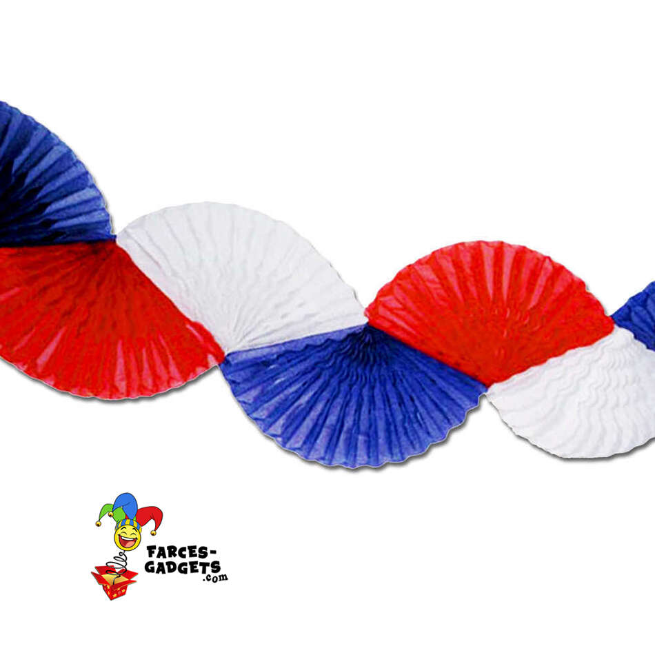 Guirlande papier éventail-soufflet, couleurs bleu blanc rouge, longueur 3 mètres. Attache pratique au moyen d’une languette large trouée.