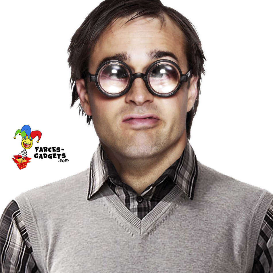 lunettes à effet loupe accessoire de déguisement débile louche benêt culs de bouteille premier de la classe coincé timide faible chétif nigaud andouille ballot bête sot niais imbécile stupide idiot cruche balourd gourde cornichon âne lourdaud