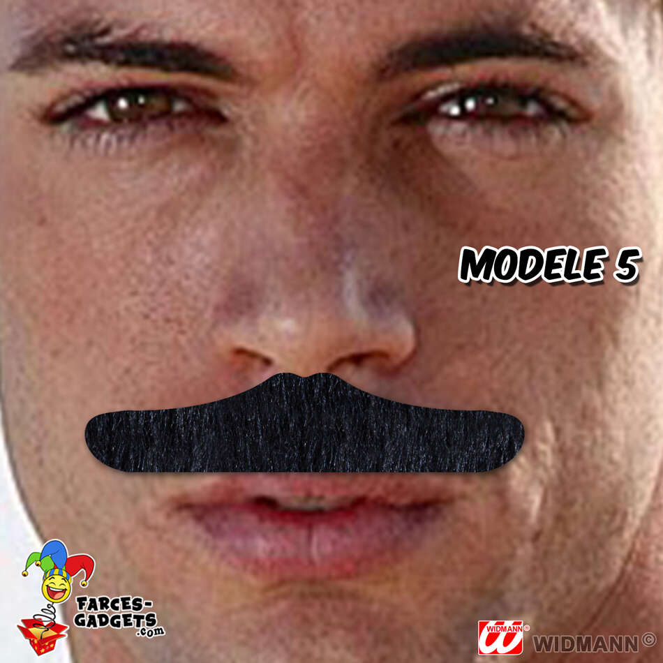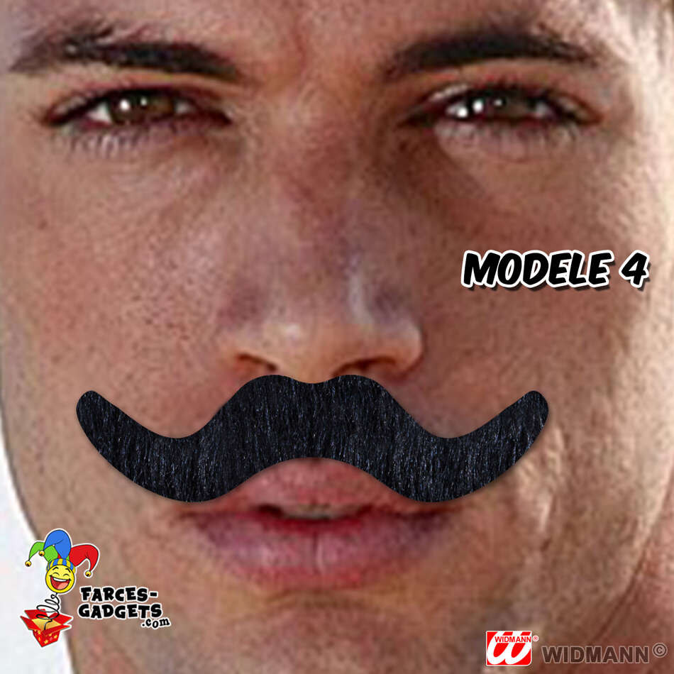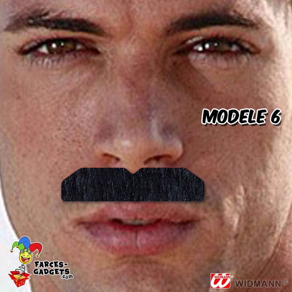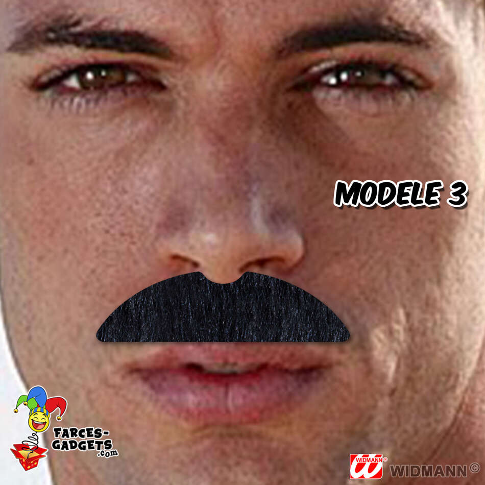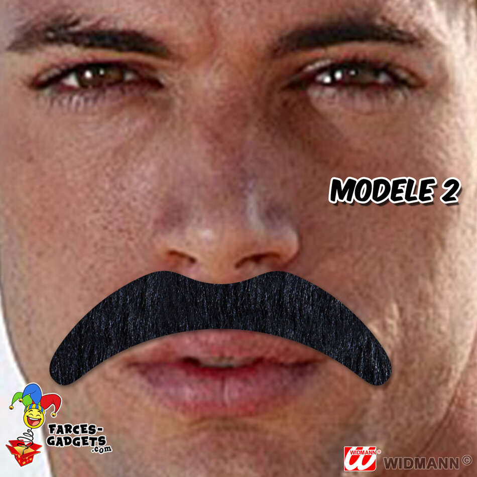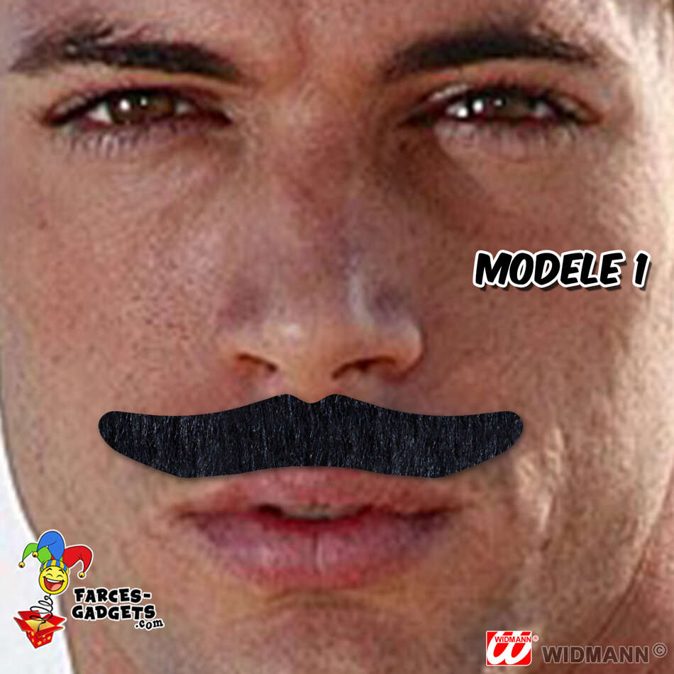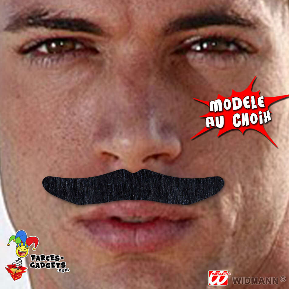 Fausse moustache brune (noire), qualité économique. Postiche autocollant réutilisable à volonté, qualité professionnelle, poils synthétiques, conditionnée sous blister. Modèle au choix parmi différentes formes, prix unitaire.