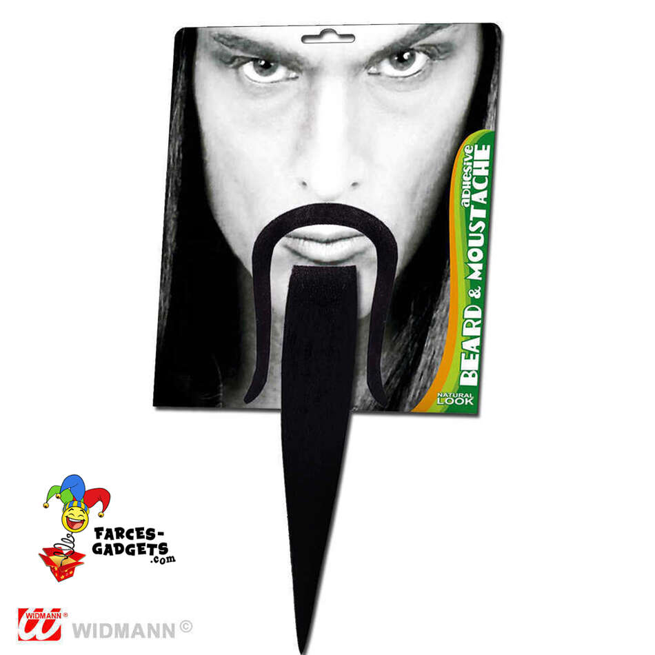 Kit complet comprenant une fausse moustache style « fu manchu » et une barbichette en pointe de mandarin, brunes et indépendantes l’une de l’autre. Postiches autocollants réutilisables à volonté, qualité professionnelle, poils synthétiques, conditionné sous blister.