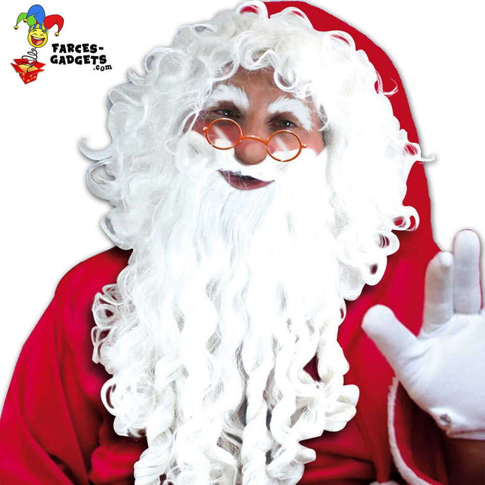 barbe et perruque blanches père noël luxe petit papa noël boucles déguisement déguiser postiche moustache sapin cadeaux hotte saint nicolas enfants joyeuses fêtes 25 décembre poils cheveux cadeaux