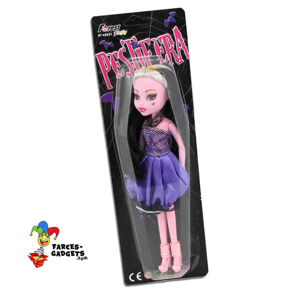 Poupée gothique vampire, présentée en boîte vitrine forme cercueil, matières plastique, taille 7 x 24 cm, tête et membres articulés, habit variable, pas le choix du modèle, prix unitaire. À partir de 3 ans.