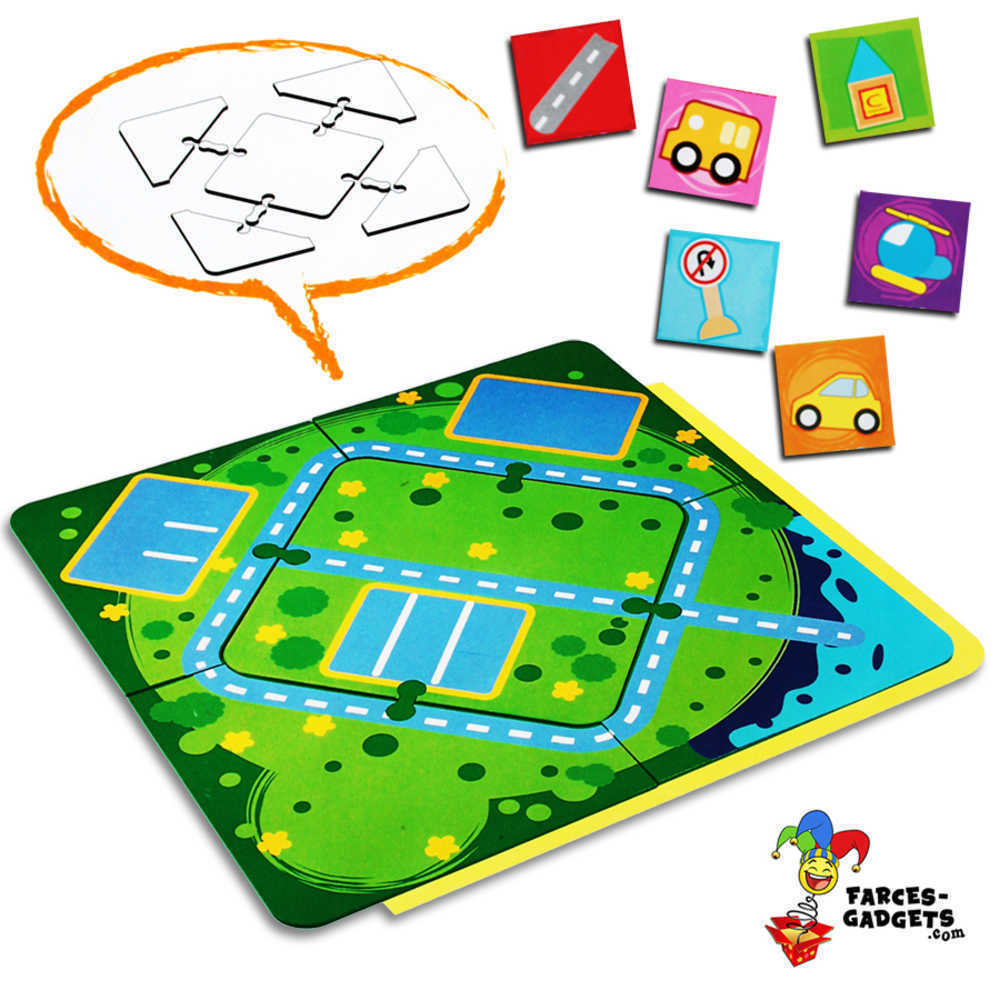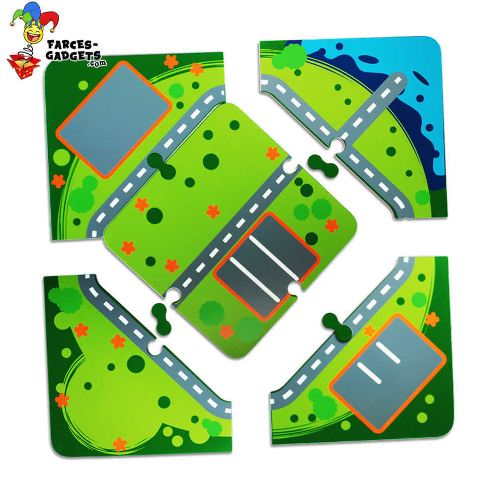 • Tapis de jeu puzzle bois circuit ville : Surface totale 60 x 60 cm, 5 éléments.